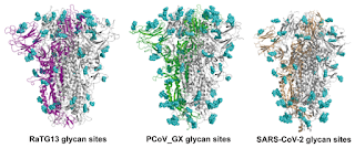 Sería un proceso complicado que ocurre en el 2 % de los complejos estudiados), la unión de una espícula a tres receptores ACE2 en la membrana celular.O , mejor expresado, a que el virus pudiera tener una " mayor posibilidad" de unirse ya que puede unirse a tres receptores diferentes al ser trímerico. Volveremos luego a ello cuando veamos las afinidades de las diferentes "espígas" de diferentes especies ( en la figura de abajo, la de murciélago de herradura, la de pangolín y las del SARS-CoV-2).